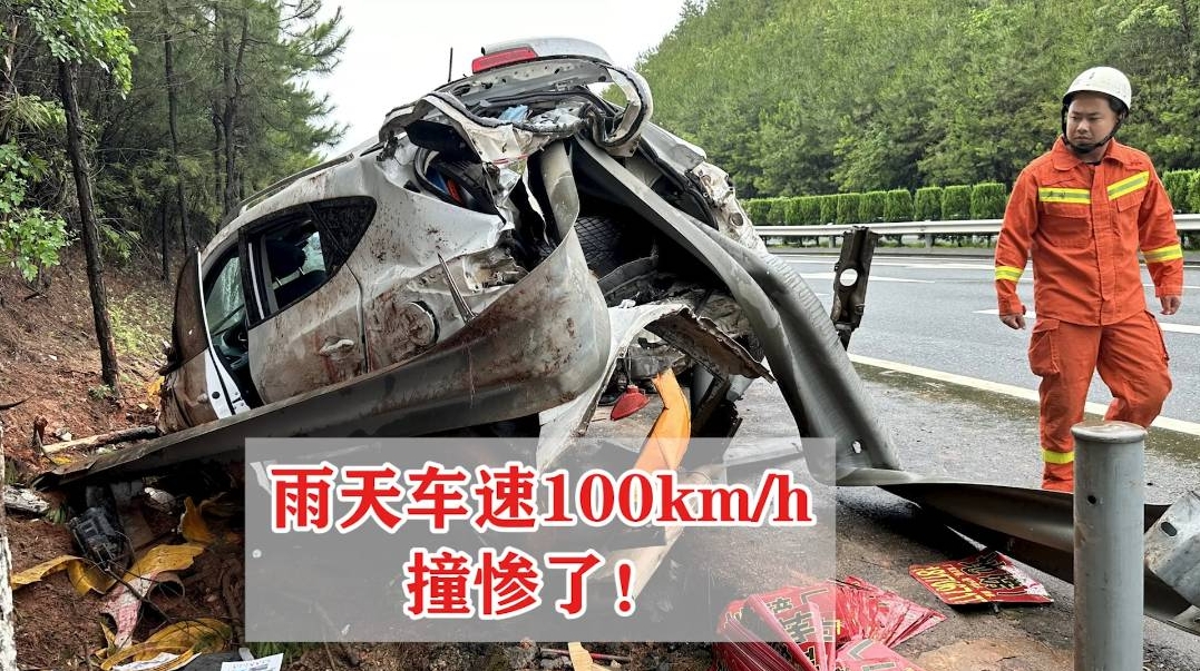 近日在泉南高速江西興國段,李某在雨天駕車時(shí),沒將路面濕滑情況放在心上,而是以100km/h的速度行駛,結(jié)果車輛突發(fā)側(cè)滑直撞路側(cè)護(hù)欄。車頭車尾均嚴(yán)重受損,車尾更是被護(hù)欄刺穿,幸運(yùn)的是未造成人員傷亡。